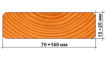 - планкен с округленными сторонами, в виде профиля банного полка или досок для скамьи. Основное предназначение, декоративная отделка, скамьи, заборы.
