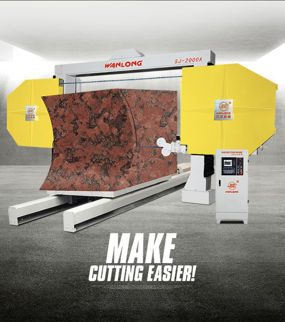 Станок для алмазно-канатной резки камня Станок имеет независимую систему направляющих на каждой колонне. Рабочие натяжные колеса станка стабильно и жестко перемещаются при работе станка вниз/вверх вдоль этих направляющих. Жесткость рабочих колес и постоянный контроль и регулировка натяжения канатов при работе, обеспечивает высокую точность резания камня. Станок оснащен высококачественной гибкой системой управления и контроля, удобным интерфейсом управления, что делает работу на нем легкой для оператора. Процесс резания камня может происходить в двух направлениях. Рабочие колеса покрыты специальным защитным 4-х слойным покрытием, что значительно увеличивает точность работы. В зависимости от необходимости линейная скорость каната может регулироваться в широких пределах. Защитная окраска станка водоустойчива и долговечна.